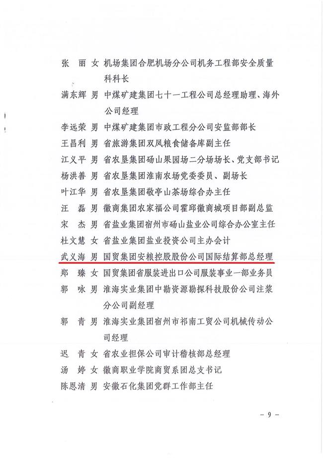 為大力弘揚(yáng)黨的優(yōu)良傳統(tǒng)和作風(fēng),激勵(lì)省屬企業(yè)廣大基層黨組織和共產(chǎn)黨員在各自工作中充分發(fā)揮戰(zhàn)斗堡壘和先鋒模范作用,七一前夕,省國(guó)資委黨委下發(fā)《關(guān)于表彰省屬企業(yè)先進(jìn)基層黨組織優(yōu)秀共產(chǎn)黨員優(yōu)秀基層黨組織書記優(yōu)秀黨務(wù)工作者的決定》,安糧控股國(guó)際結(jié)算部總經(jīng)理武義海同志榮獲安徽省國(guó)資系統(tǒng)“優(yōu)秀共產(chǎn)黨員”稱號(hào)。
