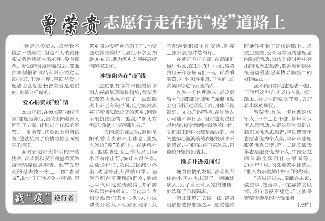 黃山人曾榮貴是安徽伊思頓糧油食品有限公司黨支部書記,他是一名傷殘退伍軍人,擔(dān)任阜陽益愛志愿者協(xié)會副會長,曾積極參與過大小百余次公益活動,被評選為“助人為樂黃山好人”稱號。在今年新冠病毒蔓延的特殊時(shí)期,曾榮貴不僅捐資戰(zhàn)“疫”,更沖鋒在前。正月初一,他就協(xié)同當(dāng)?shù)卮鍍晌e極投入到防控疫情一線,白天走進(jìn)村委會和公共場所開展防疫消毒,幫助村兩委工作人員開展出入人員管控;晚上編輯公眾號文章,宣傳防疫活動和防疫過程中的好做法,用行動踐行了共產(chǎn)黨員的初心使命,發(fā)揮了黨員的先鋒模范作用。