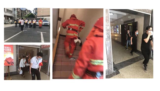 按照演習(xí)安排,監(jiān)控中心監(jiān)控員接到火警報(bào)告,大廈12樓貨梯口發(fā)現(xiàn)火情,通知巡邏崗隊(duì)員立即到報(bào)警現(xiàn)場(chǎng)確認(rèn),巡邏崗到達(dá)現(xiàn)場(chǎng)發(fā)現(xiàn)大廈12樓失火。滅火組攜帶滅火器材、破拆工具趕到火災(zāi)現(xiàn)場(chǎng)進(jìn)行撲救。疏散組迅速按緊急預(yù)案的疏散線(xiàn)路帶領(lǐng)業(yè)主們,捂住口鼻,壓低身子,有序撤離。同時(shí),救護(hù)組在濃煙中救出被困傷員,進(jìn)行緊急救治,現(xiàn)場(chǎng)做到了快速、安全、有序。