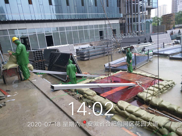 針對(duì)入梅以來(lái)嚴(yán)峻的防汛形勢(shì),已交付及在運(yùn)營(yíng)項(xiàng)目積極協(xié)調(diào)物業(yè)公司,共同迎戰(zhàn)強(qiáng)降水天氣。位于合作化路和南二環(huán)交口的安糧國(guó)貿(mào)中心是此次防汛形勢(shì)較嚴(yán)峻的重點(diǎn)項(xiàng)目,特別是降雨量突破合肥市歷史極值的7月18至19日,積水內(nèi)澇直接影響到地下室的安全。險(xiǎn)情出現(xiàn)時(shí),一線人員及時(shí)匯報(bào),各崗位人員在半個(gè)小時(shí)內(nèi)到崗參與排險(xiǎn)工作。項(xiàng)目部對(duì)地庫(kù)出入口等易形成倒灌水的危險(xiǎn)區(qū)域安排工作人員堆砌沙袋,打開(kāi)集水井蓋板,保證積水最大流量的排放。同時(shí)配合唯品會(huì)工作人員啟動(dòng)區(qū)域排水泵,對(duì)易積水難排水區(qū)域進(jìn)行再清理再疏通,隨著南二環(huán)和合作化路積水水位逐漸下降,安糧國(guó)貿(mào)中心順利通過(guò)了此次防汛考驗(yàn)。