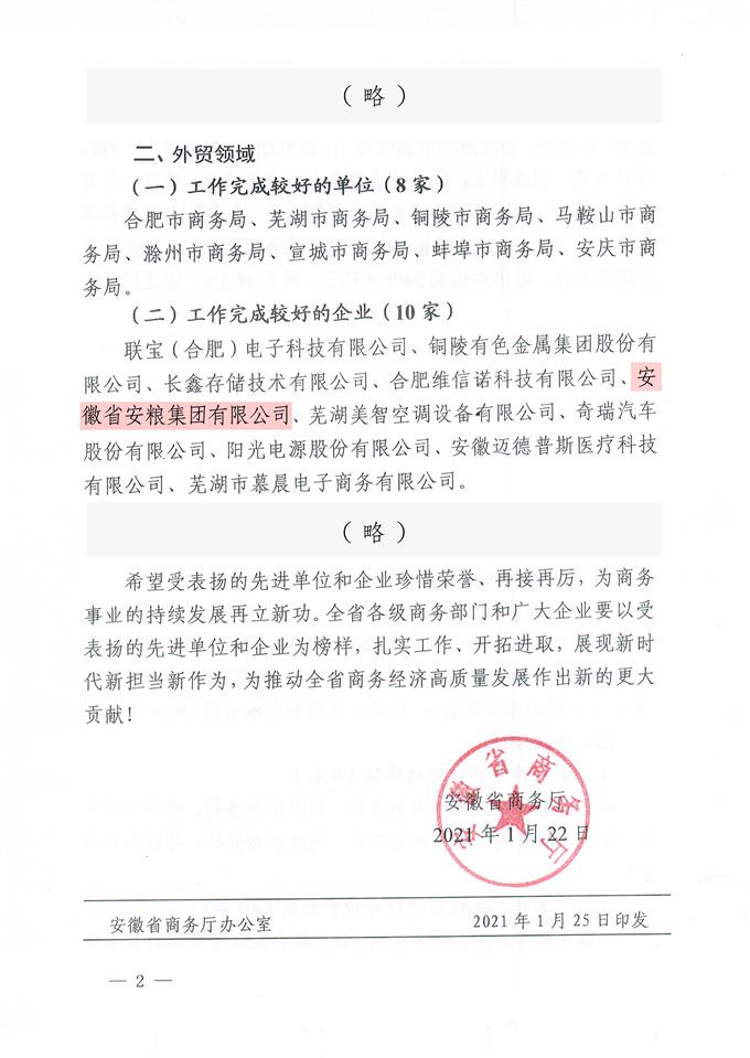 安糧集團(tuán)2020年以進(jìn)出口額超22.46億美元(海關(guān)統(tǒng)計),增速超28.56%的業(yè)績,作為省內(nèi)唯一一家入圍的專業(yè)外貿(mào)公司榮獲省商務(wù)廳的表彰。