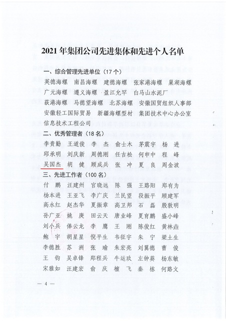 公司4人榮獲海螺集團(tuán)2021年先進(jìn)表彰