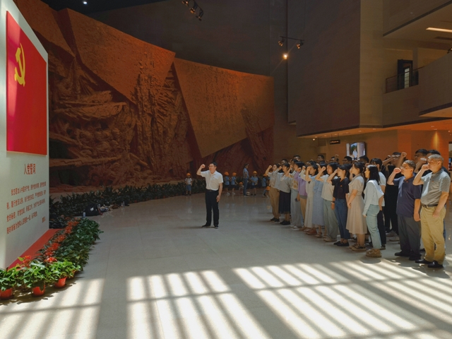 黨員們懷著崇高的敬意,傾聽革命先烈的偉大事跡,瞻仰實物文獻(xiàn),追憶波瀾壯闊的歷史,感受這場軍民團結(jié)一心的偉大勝利和永垂不朽的戰(zhàn)役精神?!岸山瓚?zhàn)役的勝利是靠老百姓用小船劃出來的?!绷?xí)近平總書記在2020年考察安徽時語重心長地說:“任何時候我們都要不忘初心、牢記使命,都不能忘了人民這個根,永遠(yuǎn)做忠誠的人民服務(wù)員?!彪S后,安糧實業(yè)的黨員們面向鮮紅的中國共產(chǎn)黨黨旗,高舉右拳,重溫入黨誓詞,鏗鏘有力的誓言回蕩大廳、激蕩人心,將不變的初心與使命鐫刻于心。