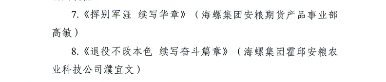 此次征文活動(dòng)榮獲佳績(jī),是對(duì)濮宜文同志、高敏同志個(gè)人事跡與工作成績(jī)的高度肯定,展現(xiàn)了安糧員工拼搏進(jìn)取、奮發(fā)向上的優(yōu)秀品質(zhì)和良好精神風(fēng)貌。希望安糧廣大干部職工立足崗位汲取榜樣力量,全面貫徹黨的二十大和二十屆三中全會(huì)精神,奮發(fā)有為、忠誠(chéng)履職,為推動(dòng)公司高發(fā)展貢獻(xiàn)力量。