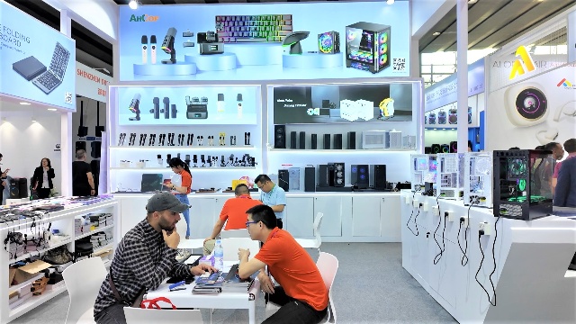 在電子消費(fèi)品類展區(qū),安糧推出了不同款式的散熱機(jī)箱,再加上融入人體工程學(xué)設(shè)計的配套鍵鼠,能滿足不同PC DIY的需求。此外,大容量、多接口、充電快的移動電源,也引得不少意向客戶紛紛下訂。
